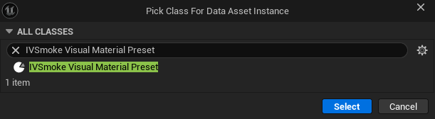 Content Drawer → Right-click → Miscellaneous → Data Asset → Select [IVSmoke Visual Material Preset]