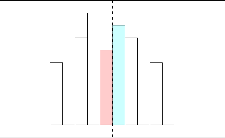 - 먼저, 주어진 범위를 정확히 반으로 분할한다. 1번과 2번에 해당하는 구간은 재귀호출로 해결할 수 있다. 3번 구간은 가운데에서 시작하여 왼쪽과 오른쪽 중 높이가 더 높은쪽으로 범위를 확장해 나가면서 넓이를 계산하는 방식으로 해결할 수 있다(이 과정은