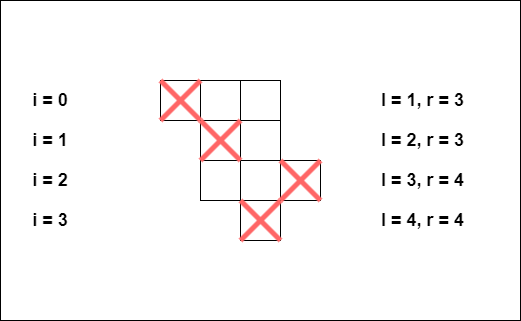 l과r을 유지하면서 정렬된 전체 구간을 순회한다. 이 때,l은 마지막으로 책이 반납된 시점을,r은 현재까지 확인한 구간 중 가장 큰 오른쪽 값을 의미한다.