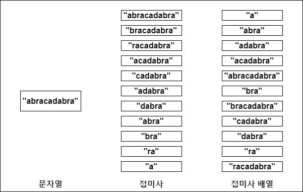 문자열 S에 대하여 S[i:]형태의 문자열들을 문자열 S의 접미사(Suffix)라고 부른다. 따라서, 문자열 S의 길이가 N이라고 한다면, 문자열 S는 서로다른 접미사 N개를 가지게 된다. 이러한 접미사들을 사전 순으로 정렬한 것을 접미사 배열(Suffix Array)이라고 부른다.