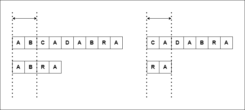 위 그림에서 볼 수 있듯이 LCP또한 접두사의 성질을 이용한다면, 빠른 시간 내에 계산할 수 있다. 접미사 S[i:]에 대하여 공통 접두사의 길이가 K라면, 앞에서 문자 하나를 제거한 접미사 S[i+1:]의 공통 접두사 길이는 아무리 작아도 K-1보다 작을 수 없다. 이 성질을 통해서 K-1개 원소의 비교를 건너뛸 수 있다.