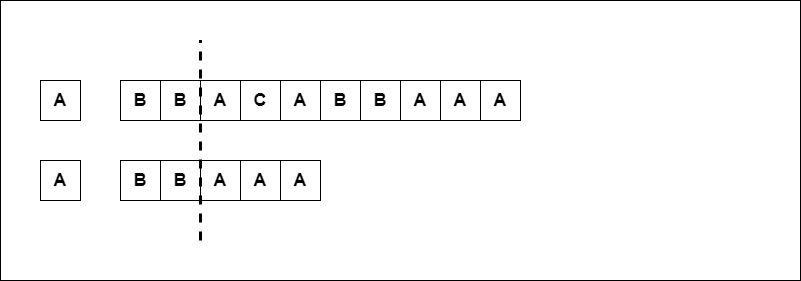 위 그림은 i=1인 경우의 결과를 통해 i=2인 경우의 순서를 알아내는 과정이다. 앞에서부터 2^1=2개의 문자만을 고려했을 때의 순서를 안다면 다음과 같은 과정을 통해서 2^i=4개의 문자를 고려했을 때의 순서를 알 수 있다.